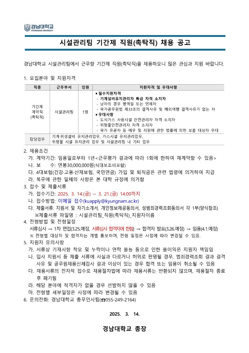 경남대학교는 경남지역의 대표적인 사학으로, 1946년 개교 이래 70년이 넘는 역사와 전통을 자랑하는 명문 대학교입니다. ‘자유, 진리, 창조’를 교시로 삼아 지역 사회 발전에 기여하고 국가와 인류 번영에 이바지할 인재 양성에 힘쓰고 있죠. 특히 산학협력, 지역사회 공헌, 혁신적인 교육 프로그램 등을 통해 급변하는 시대에 발맞춰 끊임없이 발전하고 있는 대학이랍니다. 교직원으로서 함께 성장할 수 있는 비전이 명확한 곳이라고 할 수 있어요. ✨