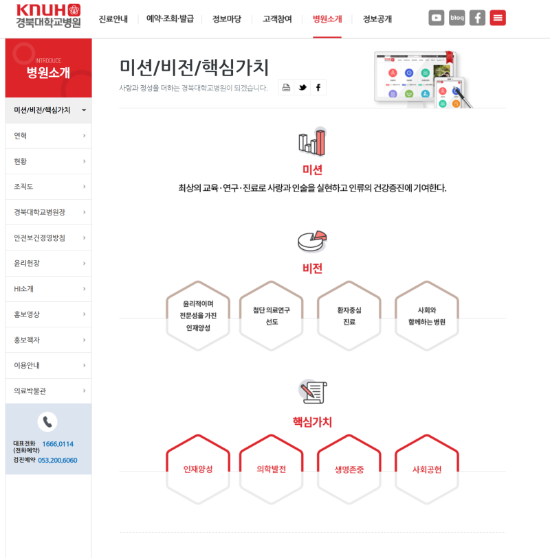 핵심 가치: 환자 중심, 존중과 배려, 혁신 추구, 사회적 책임