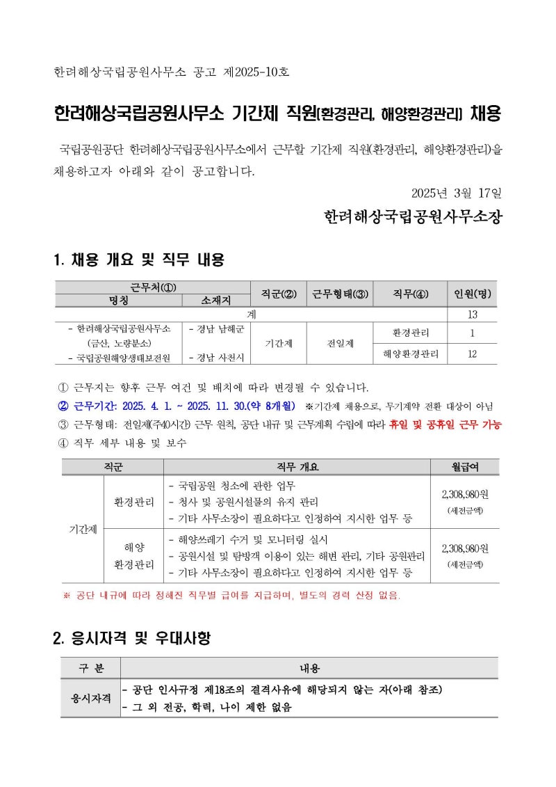 🔍 한려해상국립공원사무소 기간제근로자 (환경/해양관리) 주요 직무는?