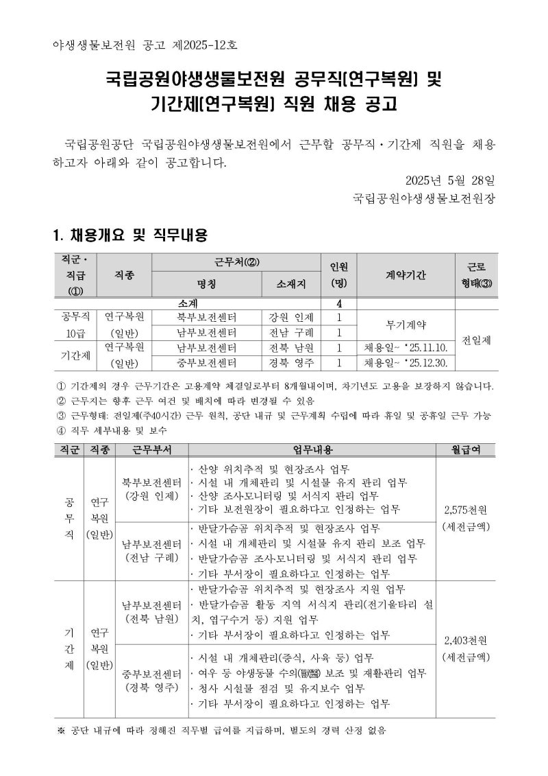 국립공원야생생물보전원 공무직 10급 주요 직무는요,