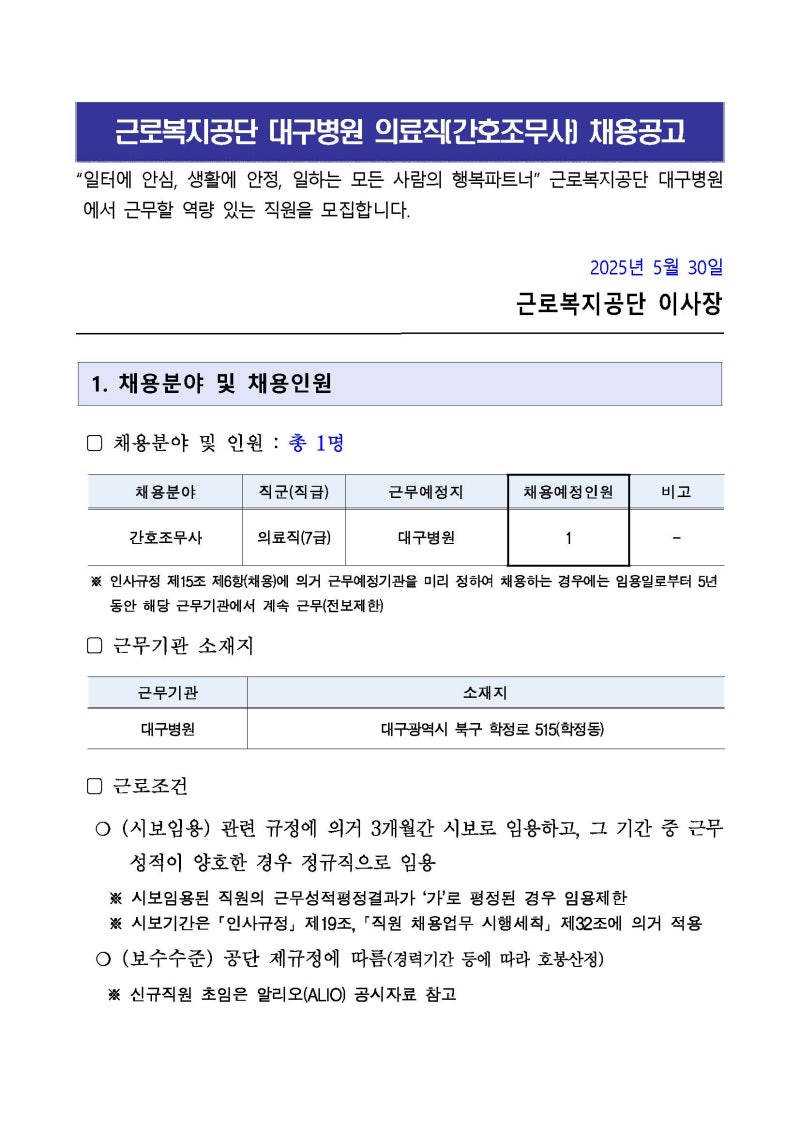 💡 근로복지공단 대구병원 간호조무사 7급 채용!