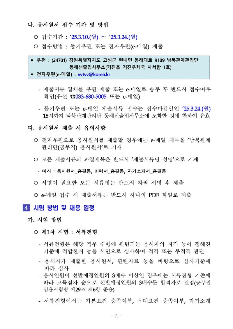 ✔️ 변화에 유연하게 대응하고 **문제 해결 능력**이 뛰어난 인재 - 💼 **주요 사업:** 남북 출입 인원/물자 통제 및 관리, 출입 절차 심사 및 보안 관리, 시설물 유지보수 및 안전 관리, 남북 교류 관련 행정 지원 등