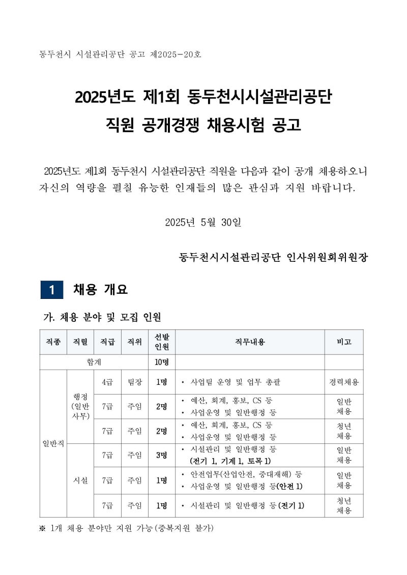 💼 동두천시시설관리공단 주요 직무 (사무직 4급 및 행정/기술직 7급)