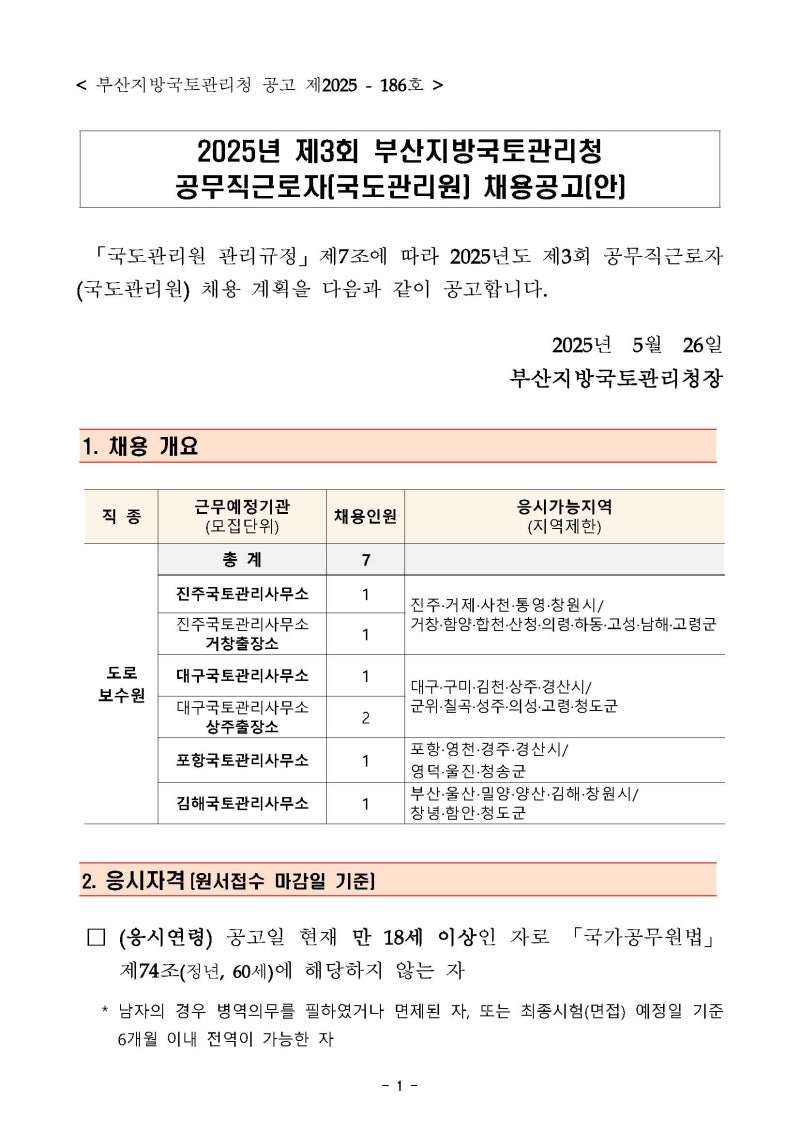 • [1] 지원동기 및 직무에 대한 이해 (부산지방국토관리청 및 국도관리원으로서의 역할에 대한 본인의 생각과 지원 동기를 기술하시오.)