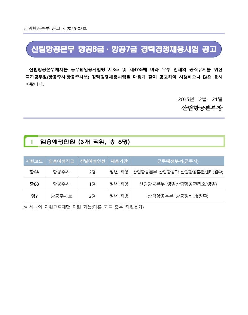 - ▲ 항공정비 (7급): 산림항공기 기체, 엔진, 계통 정비 및 점검, 항공 안전 관리 및 기술 지원, 정비 매뉴얼 숙지 및 이행, 항공기 비행 전·후 점검 및 운용 유지 관리