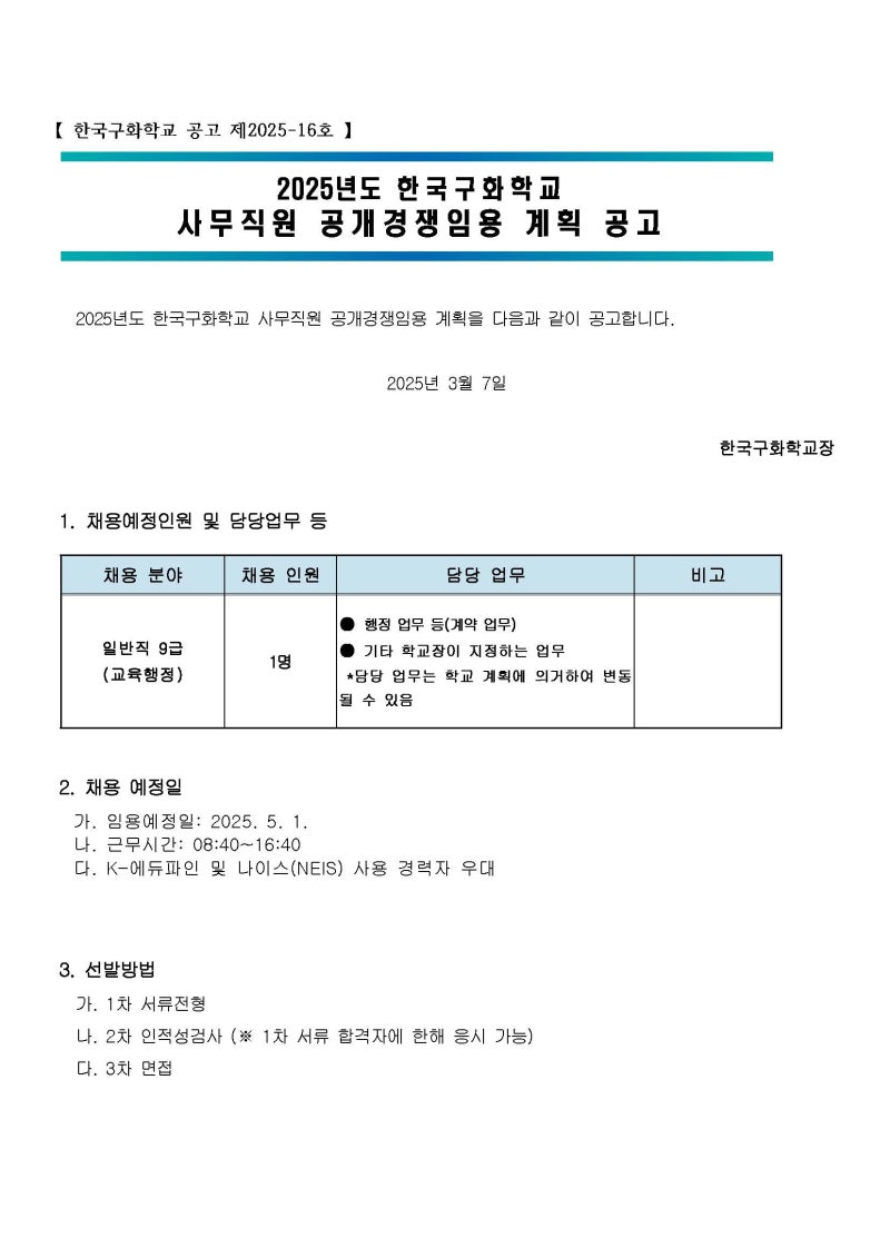 한국구화학교는 서울 강동구에 위치한 청각장애 학생들을 위한 특수학교예요. 학생들이 잠재력을 최대한 발휘하고 사회의 한 구성원으로서 당당하게 살아갈 수 있도록 전문적인 교육과 지원을 제공하는 곳이죠. 단순한 교육을 넘어, 학생들의 인성 발달과 사회성 함양에도 큰 비중을 두며 사랑과 봉사의 정신으로 운영되는 의미 있는 교육기관이랍니다. 이런 곳에서 교육행정 9급 사무직원으로 일한다는 것은 단순한 업무를 넘어 교육 현장에 기여하고, 학생들의 성장을 돕는 중요한 역할을 수행하는 것이기에 더욱 보람이 클 거예요! 💡