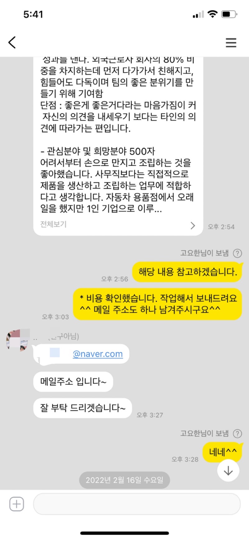 진짜 이건 거의 대필 수준으로 갈아엎었어요! 고객님이 전에 쓰셨던 자소서를 들고 오셨는데, 글자 수도 안 맞고 문장도 어색해서 첨삭하면서 거의 다시 짰다고 봐야 해요 제발 다음엔 하루 전에는 와주셔요..! 진짜 그래야 저도 여유 있게 도와드릴 수 있거든요