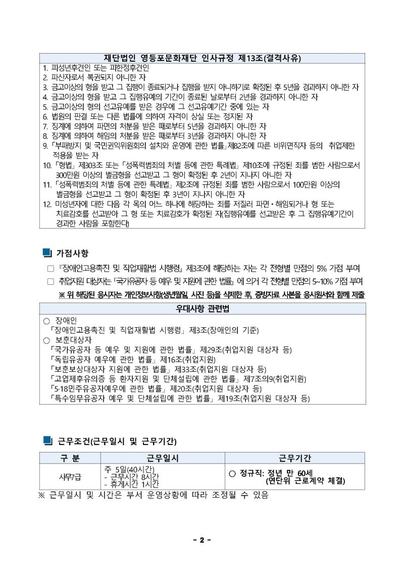 • ▲ 사무직 7급: 일반 행정 및 사무 지원, 회계 및 예산 관리, 시설 관리 및 대관 업무 지원, 사업 기획 및 운영 보조