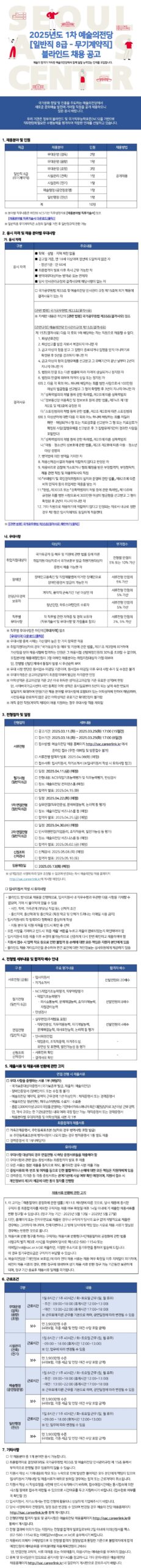 - ✔️ 인재상: 창조적 사고(새로운 시도와 변화를 통해 예술 발전을 주도하는 인재), 소통과 협력(조직 내외부와의 원활한 소통을 통해 시너지를 창출하는 인재), 책임감(주인의식을 가지고 맡은 바에 최선을 다하며 공동체 발전에 기여하는 인재)