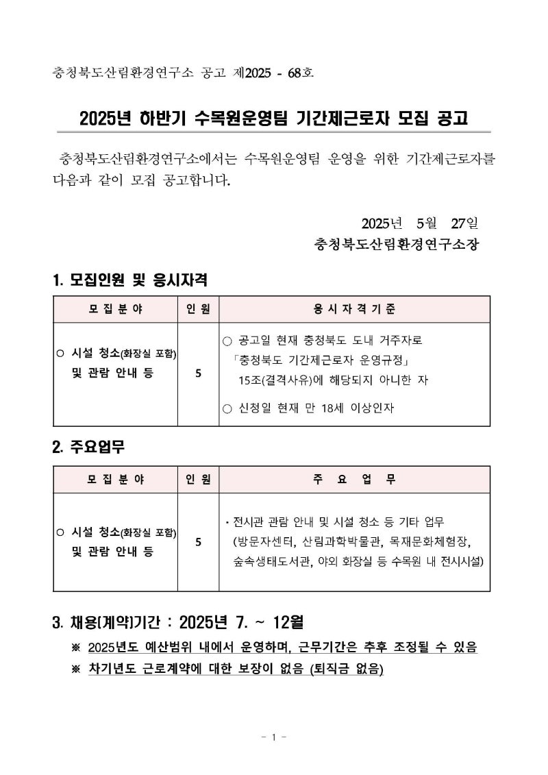 그럼 먼저, 충청북도 산림환경연구소 수목원운영팀 **시설관리 및 관람안내 기간제근로자**의 주요 직무 내용을 살펴볼까요? 꼼꼼하게 확인하고 준비해야겠죠? 😉