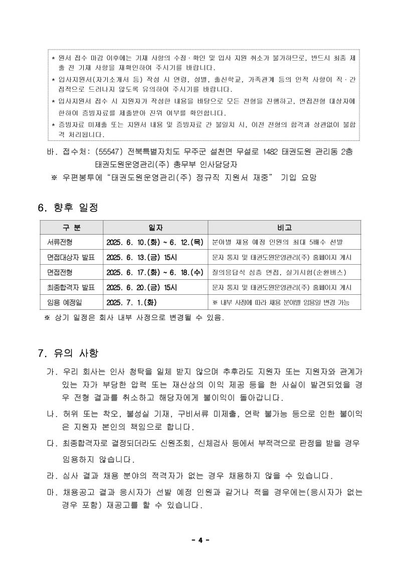 태권도원운영관리는 전 세계 태권도인의 성지이자 태권도 정신을 기리고 문화를 확산하는 복합 공간인 ‘태권도원’의 운영과 관리를 총괄하는 공공기관 성격의 단체입니다. 방문객들에게 최상의 경험을 제공하고, 태권도 가치를 알리는 데 힘쓰고 있죠. 교육, 체험, 연구, 전시 등 다양한 프로그램을 통해 태권도의 위상을 높이는 데 기여하며, 특히 이번 채용은 고객안내, 환경미화, 룸메이드, 순환버스 등 태권도원의 핵심적인 운영을 책임지는 중요한 직무들을 모집하는 만큼, 꼼꼼하게 준비해야 서류 합격의 문을 열 수 있습니다! 😉