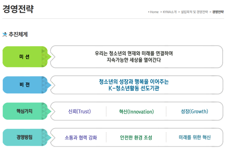 핵심 가치: 청소년 중심, 혁신 주도, 가치 창조, 미래 지향