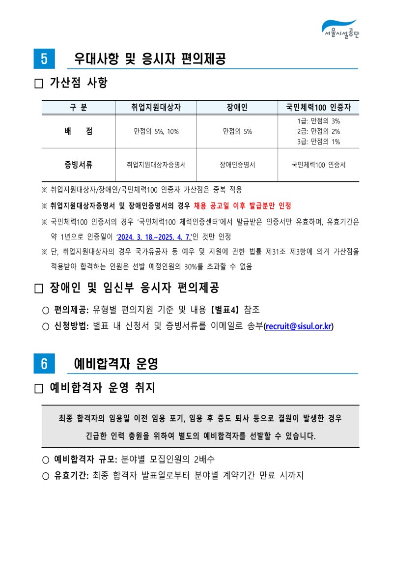 – 실천하는 인재: 책임감을 가지고 능동적으로 업무를 수행하는 인재 - 🔸 주요 사업: 도로/교량/터널 등 도시기반시설 관리, 공원/문화시설(청계천 포함) 운영, 공공체육시설, 지하도상가, 장묘시설 등 시민 편의 시설 관리 및 서비스 제공