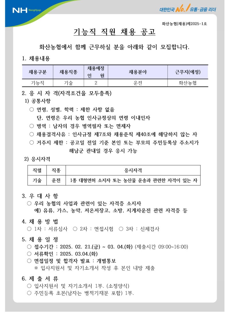 📝 자기소개서 문항 (해남군 화산농협 운전원 기능직 5급)