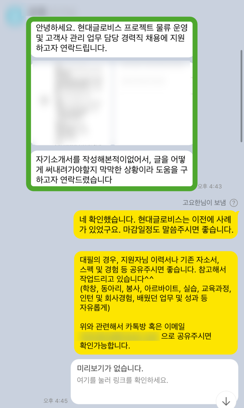 공유해주신 이력서와 자기소개서를 토대로, 지원자분의 강점과 약점을 분석했습니다. 특히 물류 직무에 대한 이해도를 높이기 위해, 현대글로비스의 사업 모델과 물류 시스템에 대한 자세한 설명을 드렸습니다.