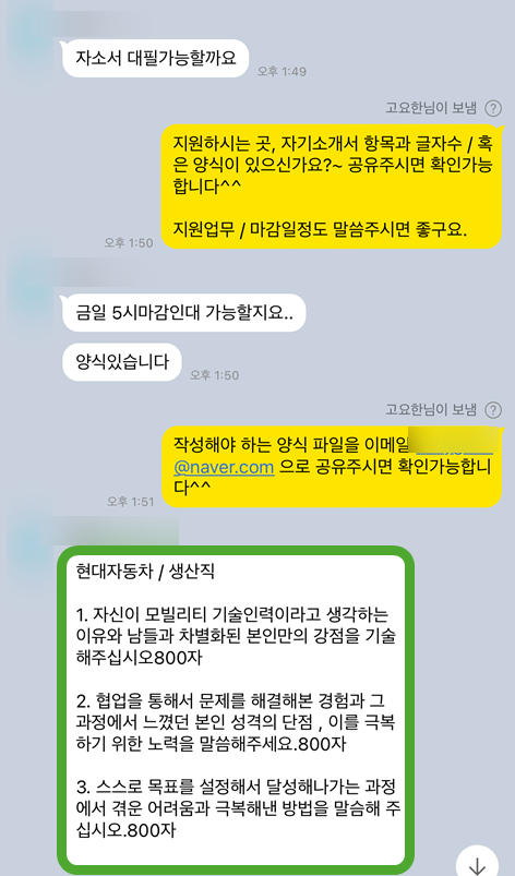 현대차 생산직 합격 자소서 컨설팅: 첨삭부터 대필까지 완벽 솔루션
