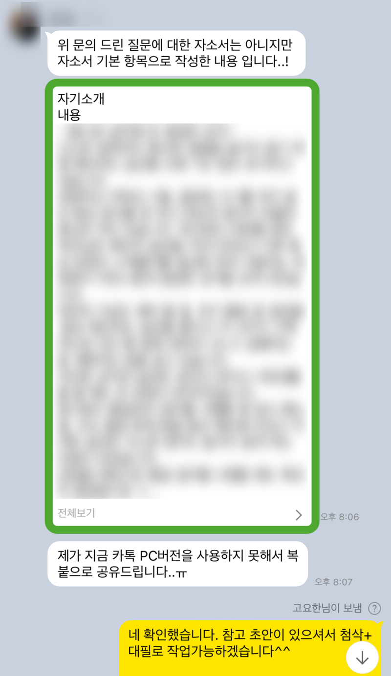 저는 여러분의 성공적인 취업을 위해 최선을 다하겠습니다. 자기소개서 첨삭, 대필, 면접 컨설팅 등 다양한 서비스를 제공하고 있으니, 언제든지 편하게 문의해주세요!
